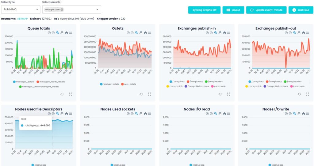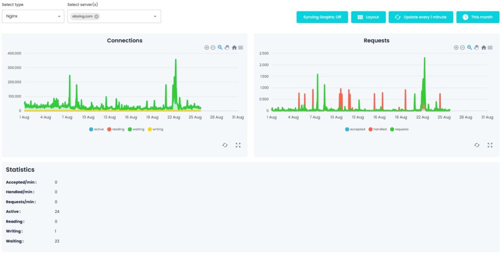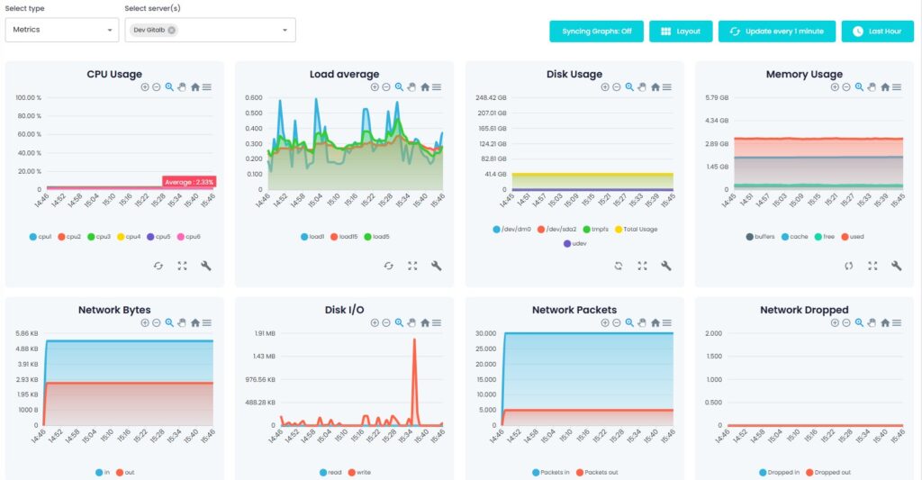 Verschaffen Sie sich mit der Metrikseite von Xitoring einen vollständigen Überblick über Ihre Integrationen. Wählen Sie Metrik-Typen aus, wählen Sie Server, filtern Sie nach Zeiträumen, synchronisieren Sie mehrere Diagramme und passen Sie Layouts an, um eine Überwachungsansicht zu erstellen, die Ihren Anforderungen entspricht. Verfolgen Sie die Leistung in Echtzeit und stellen Sie sicher, dass jede Integration vollständig unter Kontrolle ist.