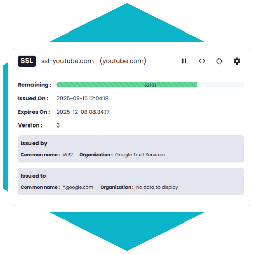 Les certificats SSL ne sont pas seulement techniques, ils sont essentiels à la confiance des utilisateurs. Xitoring surveille l'état de votre SSL et vous alerte en cas de problème, afin que votre plateforme soit toujours synonyme de sécurité, de crédibilité et de professionnalisme.
