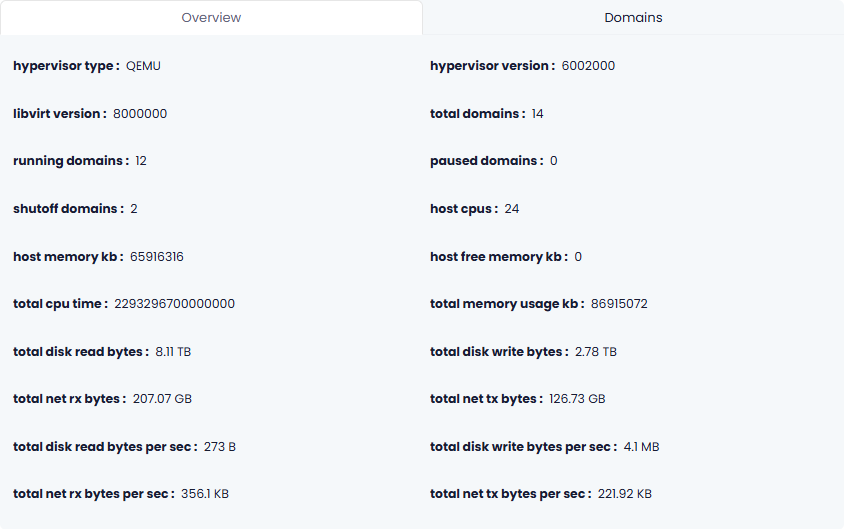 Xitoring monitors your KVM host and virtual machines in real time, providing metrics for CPU, memory, disk I/O, storage pools, and network traffic, all from one unified dashboard.